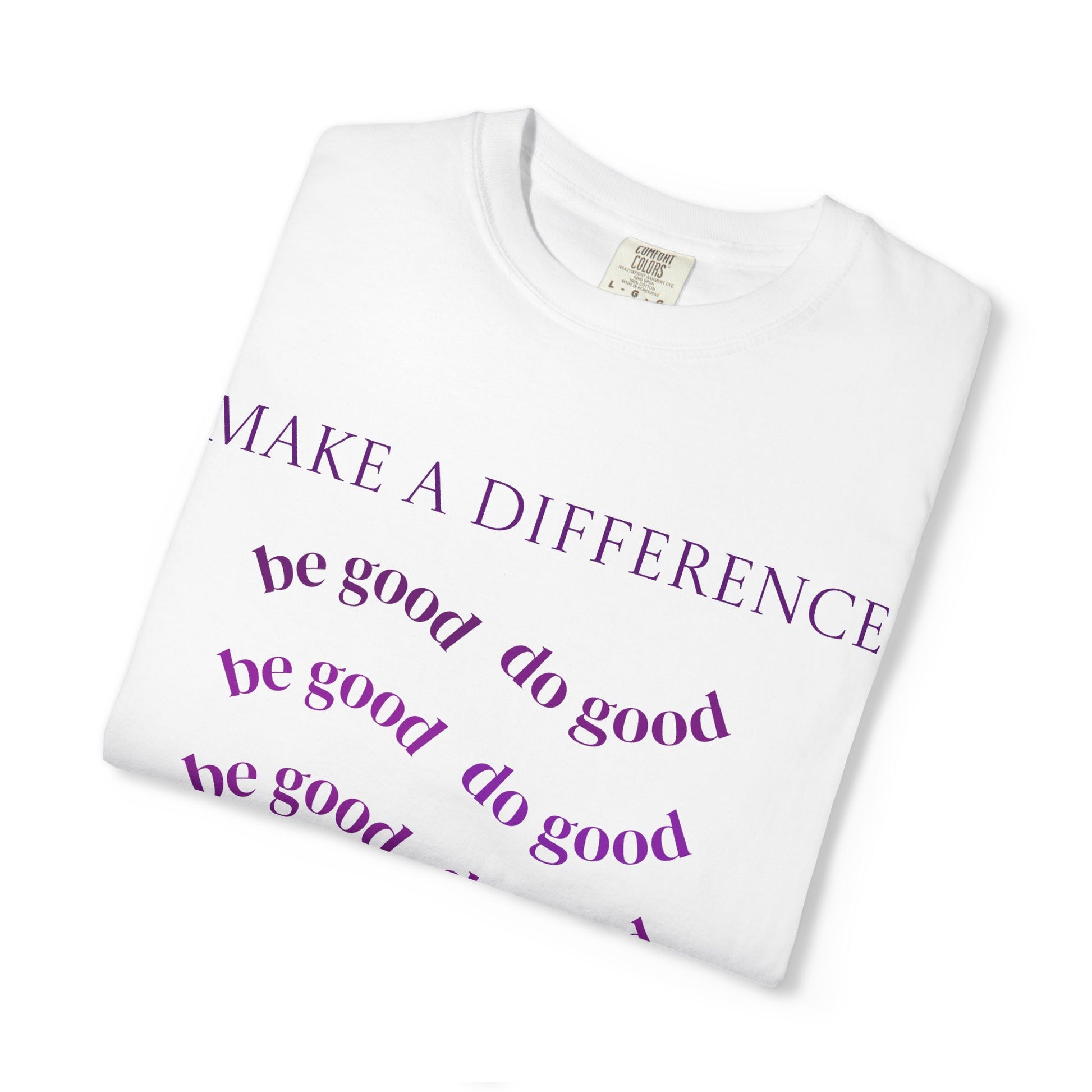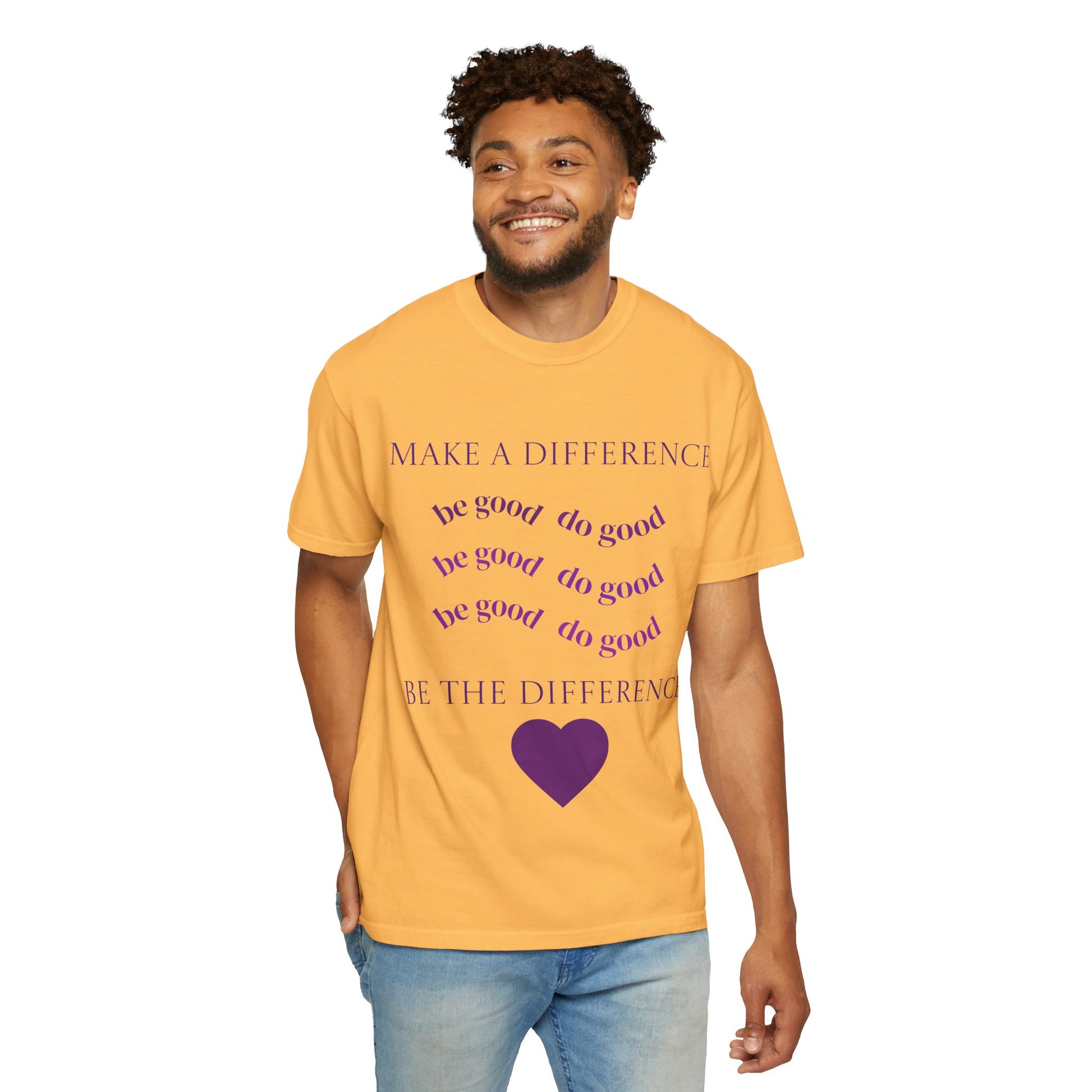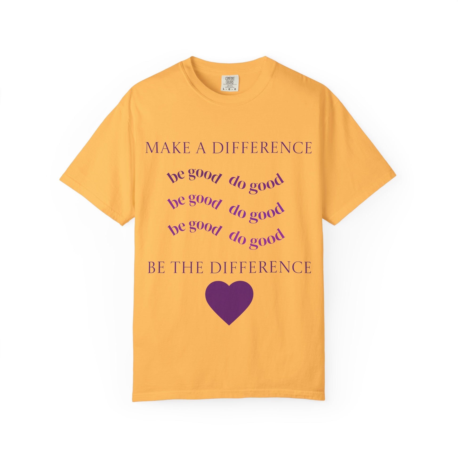 This heavyweight, garment-dyed tee carries a quiet message: small acts add up. Soft, lived-in fabric drapes easily over the shoulders while the centered typographic design — “MAKE A DIFFERENCE” and repeating “be good do good” lines with a simple heart — reads like a gentle prompt to slow down and choose kindness. Wear it to volunteer shifts, casual meet-ups, or days when you want your values visible but subtle. The relaxed fit and substantial cotton make it comfortable all day, and the muted dye gives each shirt a slightly unique, worn-in look that feels personal.